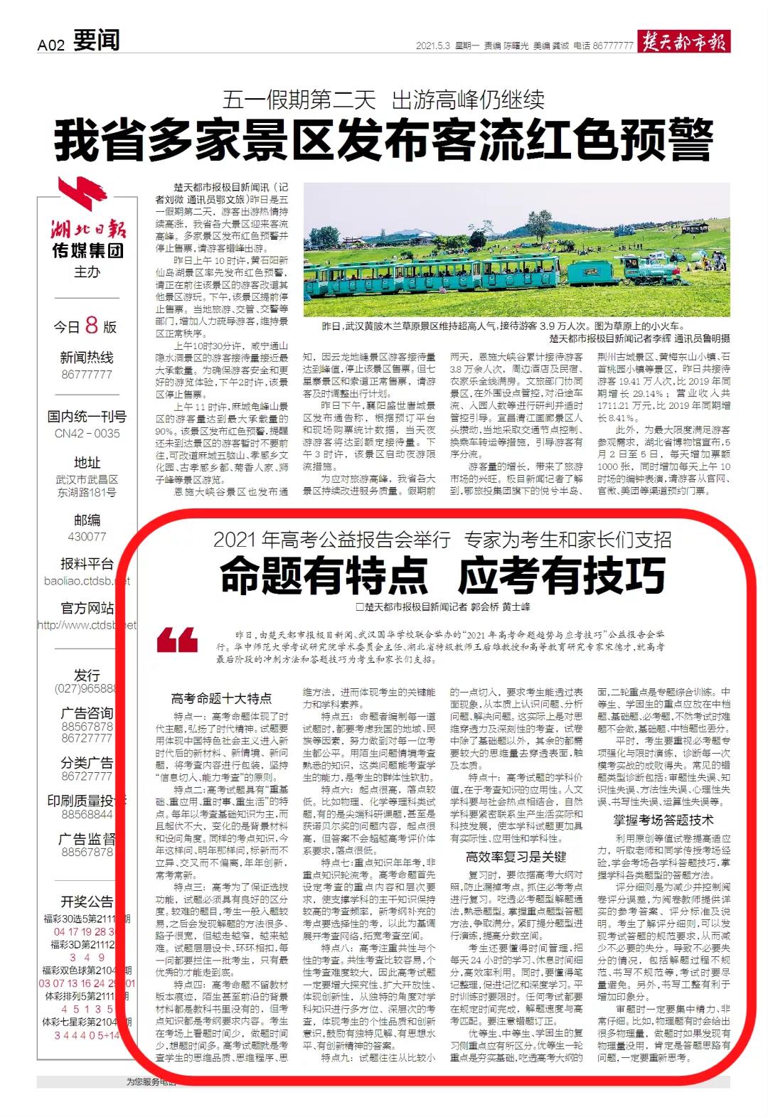 5月(yue)2日,武漢(han)國華學(xue)校聯合楚(chu)天都市報(bao)共同舉(ju)辦的(de)湖北省(sheng)2021年高考《命題趨勢與應考技巧》大型公益報(bao)告(gao)會如期(qi)舉(ju)行。全程干(gan)貨,讓到(dao)場的(de)學(xue)生和(he)家長受益匪淺,報(bao)告(gao)會取得了圓滿成功(gong)!