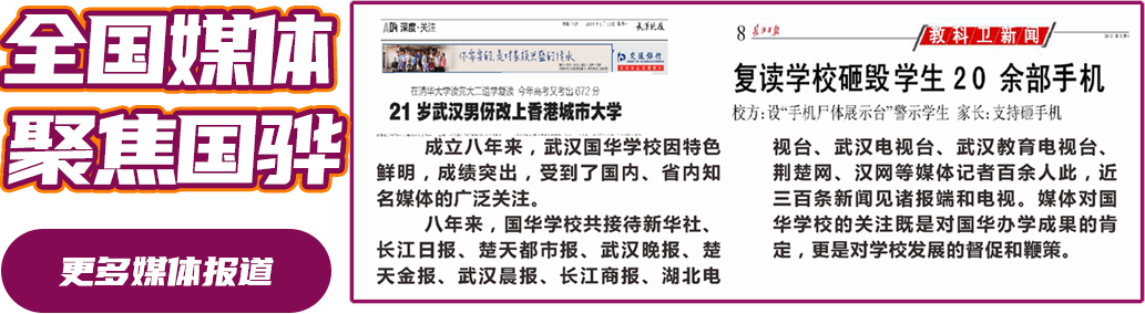 國(guo)(guo)(guo)驊教育培(pei)訓學校(xiao)辦(ban)學十年來,一直以管理嚴格、成績(ji)突出聞名全(quan)國(guo)(guo)(guo),多(duo)次被本(ben)地及(ji)全(quan)國(guo)(guo)(guo)媒(mei)體報道(dao)。2010年國(guo)(guo)(guo)驊3名學子考取北大(da)、清華(hua),被鳳凰網、人民(min)網等全(quan)國(guo)(guo)(guo)媒(mei)體關注、報道(dao);2012年,國(guo)(guo)(guo)驊“史上最嚴校(xiao)規”被《新華(hua)每日電(dian)訊》等全(quan)國(guo)(guo)(guo)兩百多(duo)家媒(mei)體關注,引發(fa)了全(quan)國(guo)(guo)(guo)性的(de)教育大(da)討論,學校(xiao)的(de)措施得到了教育界及(ji)家長的(de)理解和支持。